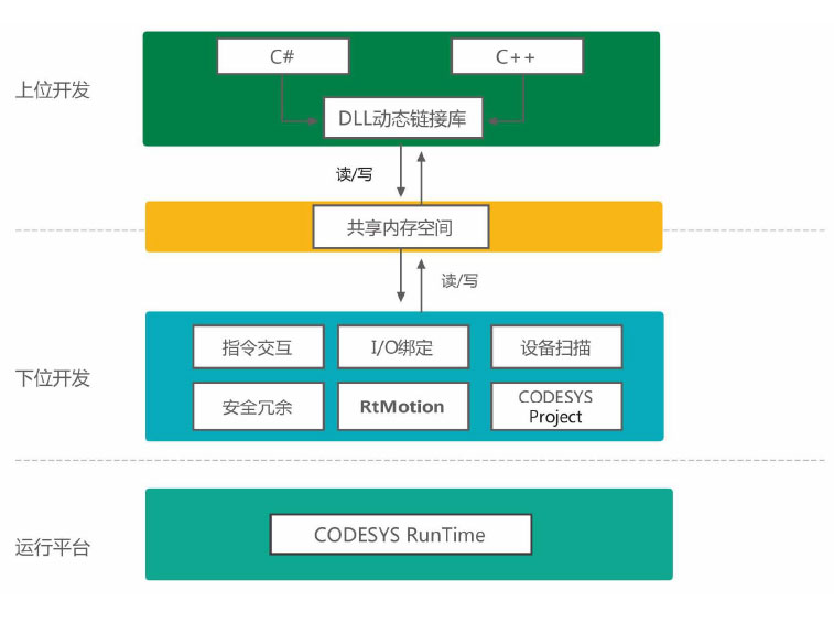 RtMotion運動控制庫提供上位開發接口函數,可(kě)支持C#/C++編程。基于CODESYS RTE程序在工(gōng)控機中(zhōng)運行。通過共享内存空間進行運動控制。具(jù)體(tǐ)結構如下圖2.1所示: